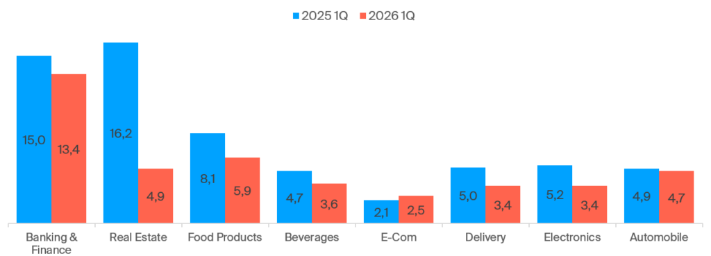 Закономерным итогом стал органический спад в первом квартале 2026 года – совокупные инвестиции в DOOH снизились до 5,1 млн долларов (против 8,2 млн за аналогичный период 2025-го). Одной из главных причин такой динамики стало резкое сокращение бюджетов со стороны крупных застройщиков (категория «Недвижимость»), лидировавших в прошлом году. Сегодня же статус самых активных рекламодателей в «наружке» перехватили бренды из сектора Banking & Finance.