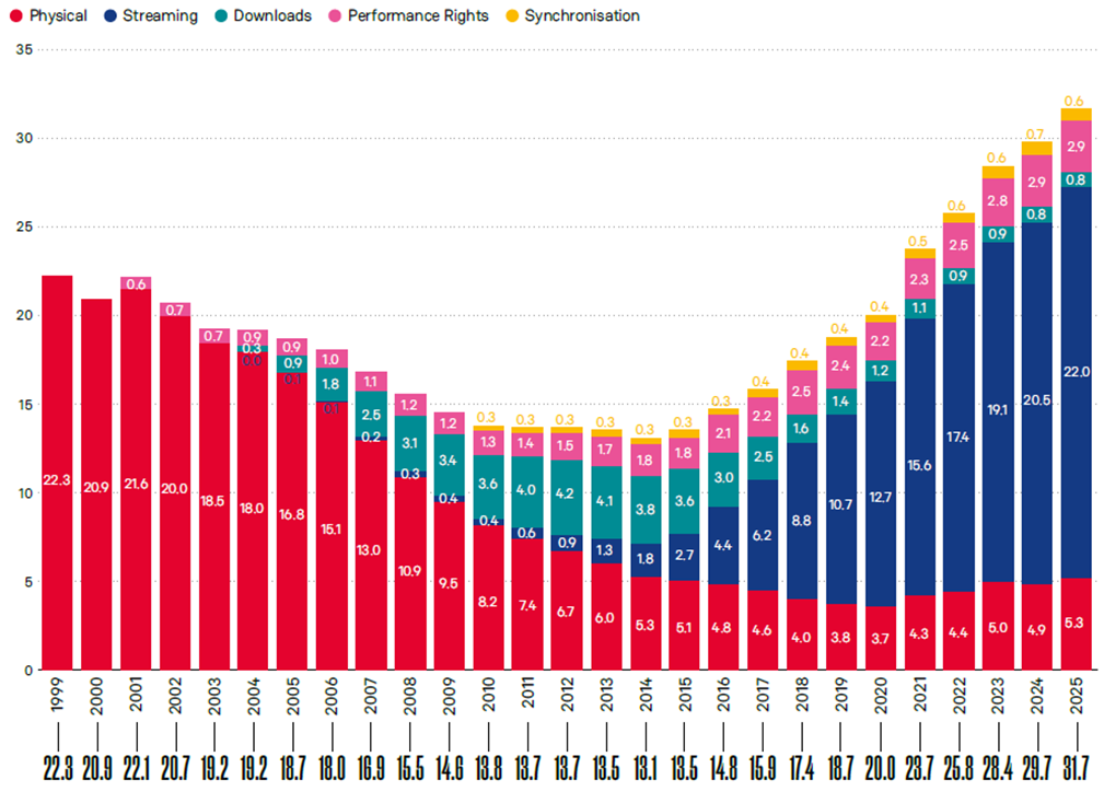 Если раньше музыкальный бизнес опирался на продажи физических носителей и скачивания, сегодня его ядро — стриминг. На него приходится почти 70% всей выручки, а платные подписки обеспечивают более половины доходов индустрии.