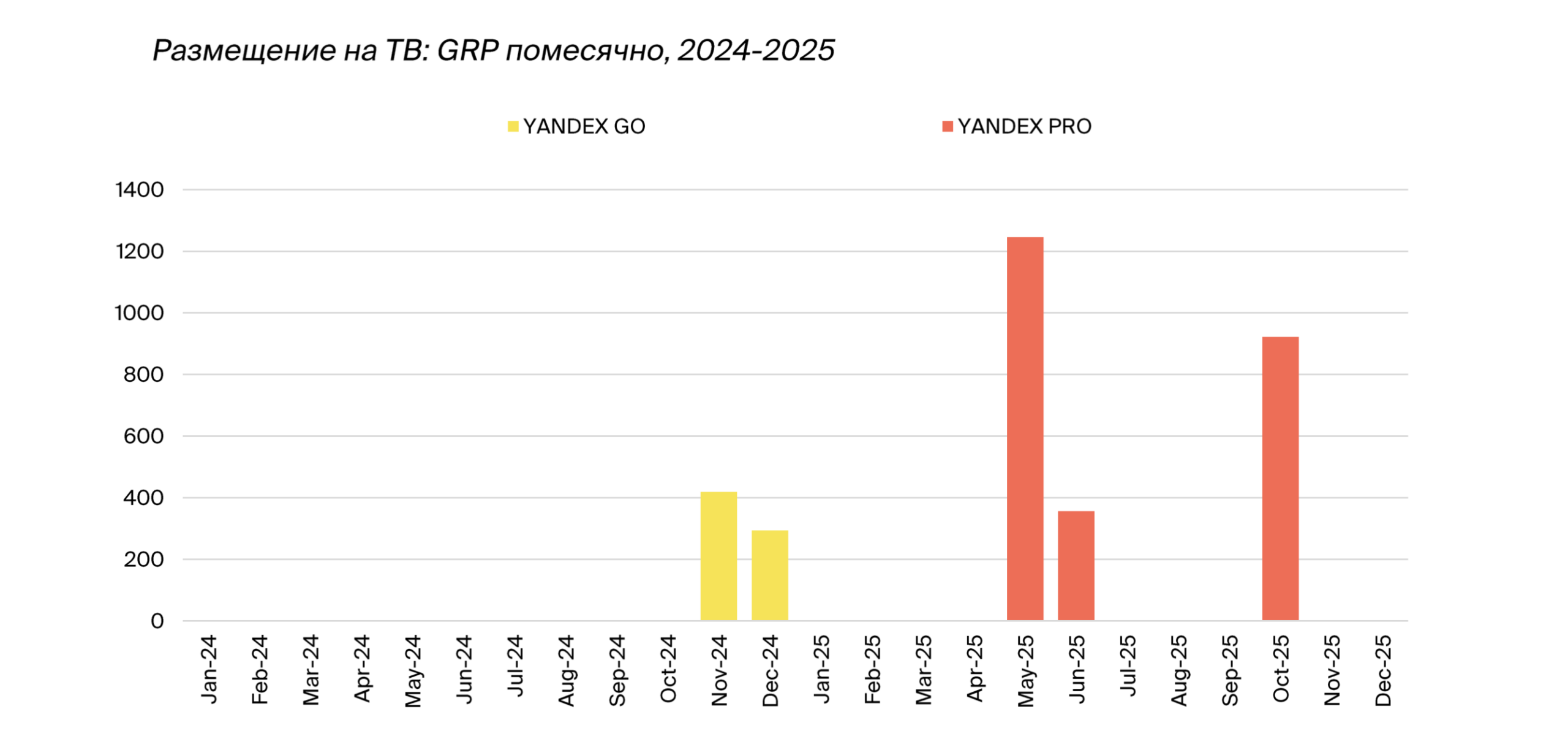Yandex, будучи лидером категории, инвестирует в медиа больше всех. В частности, бренд активно размещается на ТВ, что говорит о республиканском масштабе деятельности и экспансии в регионы. При этом, если в 2024 был небольшой флайт для классического Yandex Go (коммуникация с конечными пользователями), то в 2025 бренд активно шёл в два флайта с Yandex Pro, продвигая и сервис такси, и платформу для водителей.