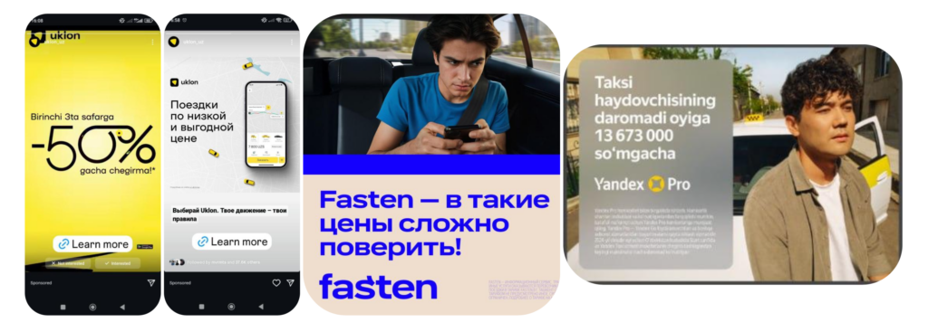 Другие игроки активны в наружной рекламе и Digital медиа, целясь на аудиторию Ташкента и крупных городов – в частности, на LED-экранах столицы, помимо Yandex Go и Yandex Pro, была реклама сервисов Uklon, Fasten, Like Taxi, Taxi Airport. При этом, у Uklon – 31% доли голоса: бренд составлял активную конкуренцию сервисам Yandex на протяжении всего года.