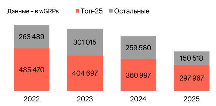 На графике ниже видно, что общий вес в взвешенных рейтингах (wGRP) за 4 года сократился с 748 тысяч до 448 тысяч (-40%). При этом, заметно, что основной вес приходится на топ-25 самых крупных рекламодателей. В 2025 совокупный вес топ-25 самых крупных покупателей ТВ-рекламы вырос с 60% до 67%, то есть общая доля крупных компаний увеличилась, а присутствие менее крупных и средних бизнесов сократилось, что говорит о том, что ТВ становится «закрытым клубом» для гигантов.