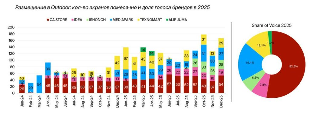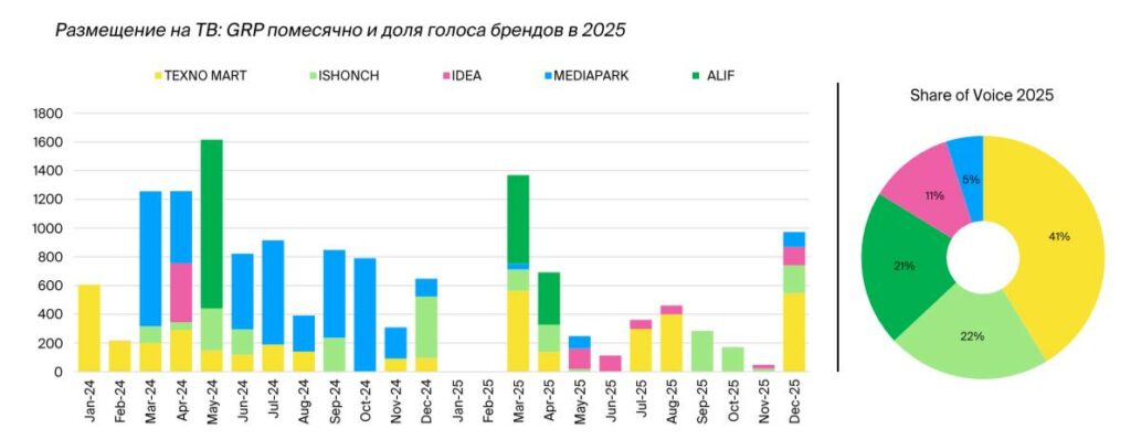 Классические ритейлеры довольно долго большими объёмами шли на телевидении, однако в 2025 заметен курс на рост рекламы в интернете и наружной рекламе. На ТВ большим объёмом в 2025 продолжил идти Техномарт, кроме того, весной высоким весом размещался Alif с акцией Juma.